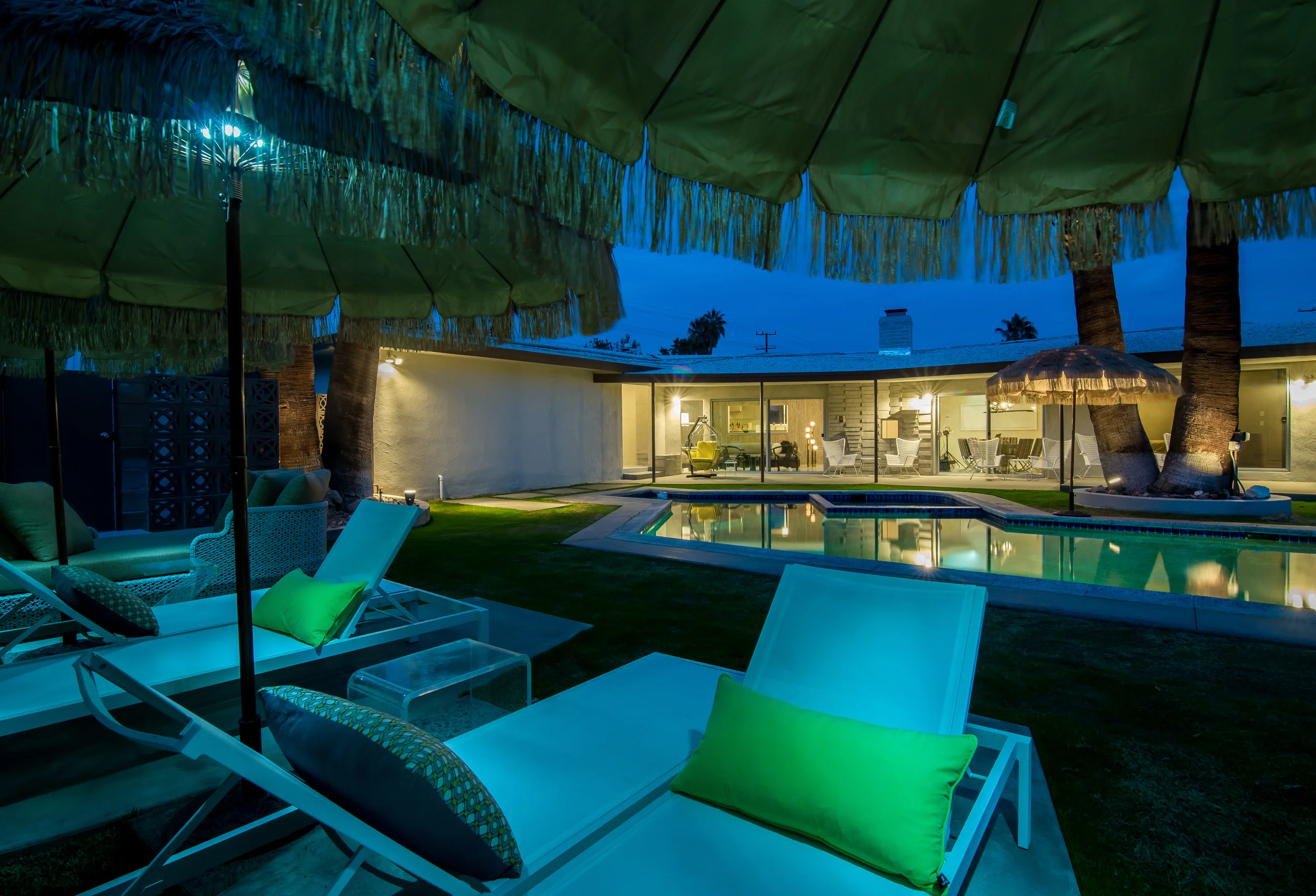 Built in 1958, the “boomerang” shape of Burton House is a tribute to its era and provides fabulous separation of living space and guest quarters. Featuring dual bedroom suites and expansive common areas both indoors and out, this Palm Springs vacation home allows all guests to relax either as a group or on their own. Many of the architectural design elements of Burton House are attributed to the work of the notable Paul R. Williams, with his influences seen throughout the home. The home features important vintage and custom designer furniture, lighting and drapery.